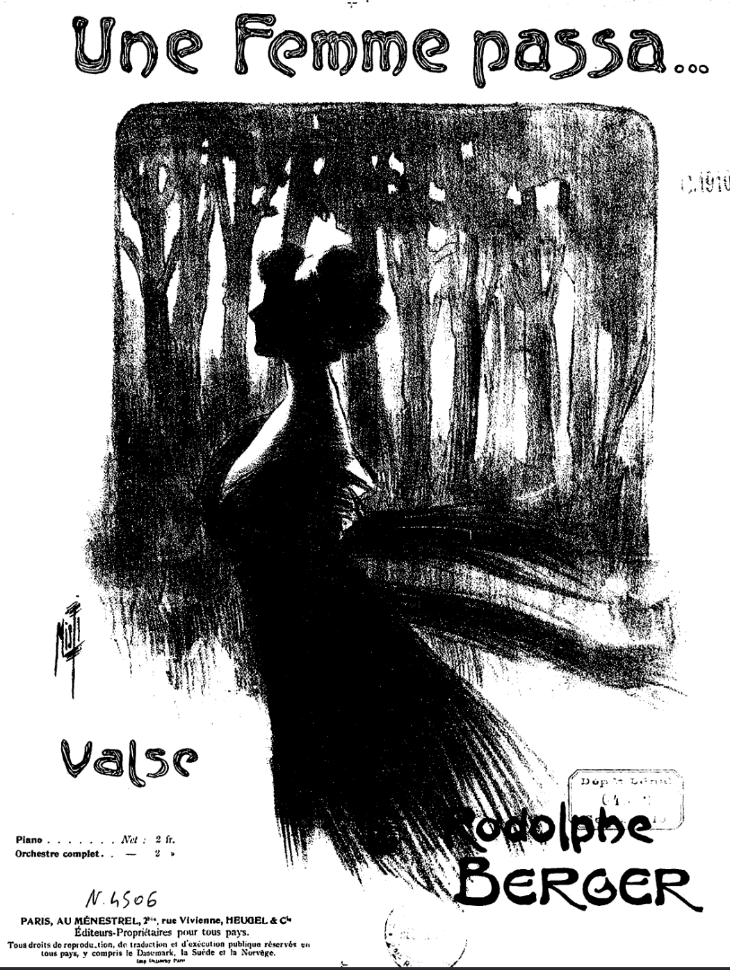 20世紀初頭のワルツの雰囲気もさることながら,楽譜表紙のイラストがまたベル・エポックっぽくていい。Une femme passa というワルツの表紙は,森の中を彷徨ってる女性の版画風。